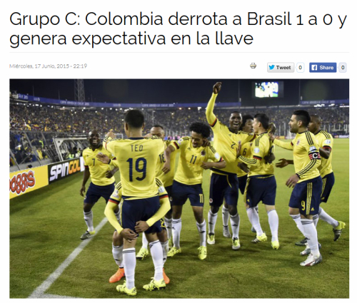 콜롬비아는 18일 오전 9시(브라질시간) 칠레 산티아고의 에스타디오 마뉴멘탈 다비드 알레야노에서 열린 브라질과의 2015 칠레 코파아메리카 C조 조별예선 2차전 경기서 1-0으로 승리를 거뒀다. 남미 최강의 맞대결로 관심을 모은 브라질과 콜롬비아의 경기는 헤이손 무리요의 천금같은 결승골로 콜롬비아의 승리로 돌아갔다.