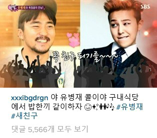 지난 25일 지드래곤은 자신의 인스타그램을 "야 유병재 콜이야. 구내식당에서 밥 한끼 같이 하자. 유병재, 새친구"라는 글과 영상을 게재했다.