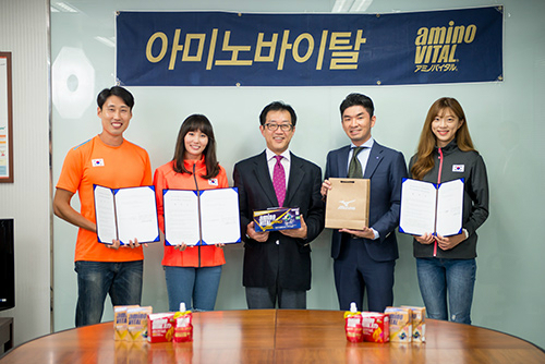 지난 2일 서울 영등포구에 위치한 한국아지노모도주식회사에서 육상선수 110m허들 박태경, 100m허들 정혜림, 장대높이뛰기의 최예은과 함께 ‘아미노바이탈 공식 후원 협약’을 체결했다.