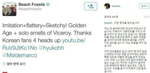 30일 비치 파슬스는 공식 트위터에 혁오의 노래가 자신들의 곡