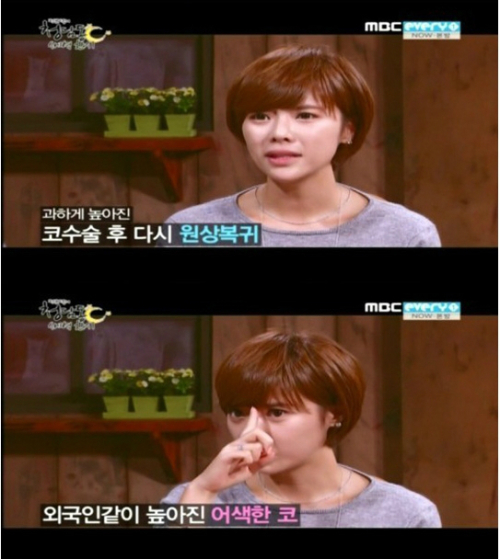 황정음은 이어 정보석이 "지금은 본인의 코냐?"고 질문하자 "내 코인데, 이물질이 조금 남아있는 것 같다. 다 못 뺀것 같다"며 "그랬더니 코가 좀 통통해져서 더 예뻐진 것 같다. 수술 안한 코 같은 느낌이라서 좋다. 원래는 더 뾰족했다"며 거침없이 밝혔다.