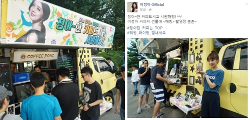 지난 12일 이청아는 현재 촬영중인 영화 ‘해빙’ 촬영 현장에 커피차를 선물해 훈훈한 분위기를 자아냈다. 이번 커피차 선물은 한 여름 무더위로 고생하는 동료 배우들과 스태프들을 위해 이청아가 준비한 것으로 폭염으로 지친 스태프들은 깜짝 등장한 이청아의 커피차 선물에 잠시나마 시원한 휴식시간을 보냈다는 후문.
