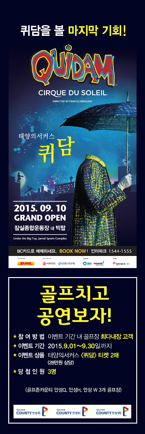 먼저, 골프존카운티 안성지역 골프장을 대상으로 한 가을맞이 문화 이벤트가 마련됐다. 이달 30일까지 골프존카운티 안성H, Q, W 3개 골프장 최다 내장객 각 1명에게 태양의서커스 '퀴담' 공연 티켓을 2매씩 제공할 예정이다.