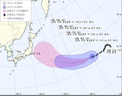 6일 기상청에 따르면 태풍 킬로는 이날 오전 9시 현재 일본 도쿄 동남동쪽 3250㎞ 부근 해상까지 접근했다.