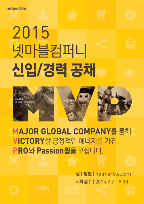 접수는 오는 30일까지 넷마블컴퍼니 인터넷 홈페이지( www.netmarble.com)에서 가능하다. 서류전형 후 신입은 필기전형, 면접, 인턴십(8주)을 거쳐 최종 합격자를 가리게 된다. 경력직의 경우 실무면접, 임원면접 순이다. 회사 관계자는 “넷마블은 게임에 대한 열정을 갖고, 최고가 되고자 노력하며, 전략적으로 생각하는 인재를 우대하고 있다”며 “국내·외에서 인정한 개발력, 운영 서비스를 기반으로 글로벌 게임회사로 도약하고 있는 넷마블에 전문가와 열정적인 인재들의 많은 지원을 바란다”고 말했다.