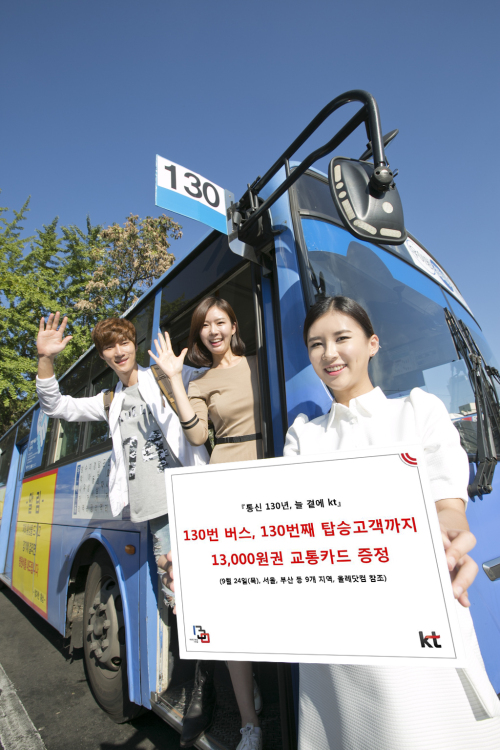 KT는 대한민국 통신 130년을 맞아 다양한 온·오프라인 이벤트를 마련했다. 사진은 KT 모델들이 130번 버스 이벤트를 위해 포즈를 취하는 모습. 사진제공=KT