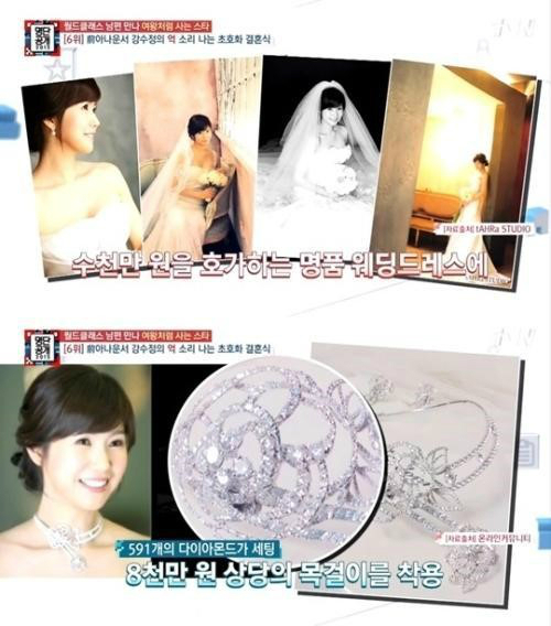 결혼 당시 강수정은 수천만 원을 호가하는 웨딩드레스와 목걸이 등으로 그야말로 '억'소리 나는 결혼식을 올려 화제가 되기도 했었다.