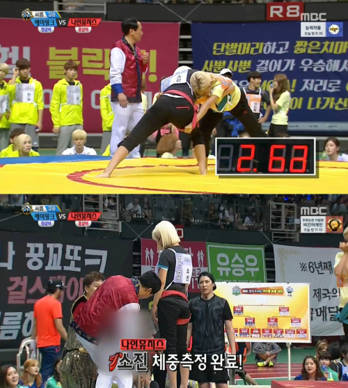 | 그룹 에이핑크의 윤보미와 나인뮤지스 소진이 ‘아육대’ 씨름 종목 첫 체중 공개 주인공이 됐다. 사진=MBC'아육대'방송 캡처 |