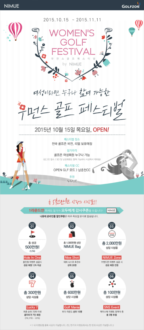 골프존은 15일부터 오는 11월 11일까지 '우먼스 골프 페스티벌(Women's Golf Festival by NIMUE)'을 실시한다고 밝혔다. ㈜커먼웰스와 함께 펼치는 이번 이벤트는 전국 골프존 비전, 리얼 보유 매장 대상으로 열린다.