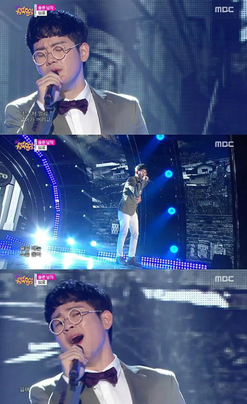 | 가수 브로가 ‘쇼! 음악중심’에서 독특한 가사의 ‘슬픈 남자’ 무대를 꾸몄다. 출처=MBC방송캡쳐 |