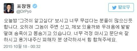 표창원 소장은 18일 트위터를 통해 “‘그것이 알고싶다’ 보시고 너무 무섭다는 분들이 많으신 듯 합니다. 오히려 그놈이 주변 신고, 제보 있을까봐 두려움에 발발 떨며 숨죽이고 몸 숨기고 있습니다”라며, “너무 걱정 마시고 문 단속 잘하시고 용기내주신 피해자 분 생각하셔서 힘 합쳐주세요”라는 글을 남겼다.