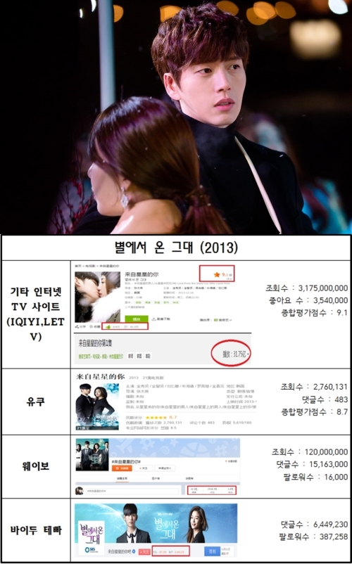 그렇다면 박해진 주연의 한국 드라마 성적은 어떨까. ‘소문난 칠공주’, ‘하늘만큼 땅만큼’, ‘에덴의 동쪽’, ‘열혈장사꾼’ 등 국내 작품을 통해 중국 팬들에게 서서히 얼굴을 알린 박해진은 2012년 ‘내 딸 서영이’(최고 평점 9.4, 조회수 1800만), 2013년 ‘별에서 온 그대’(최고 평점 9.1, 조회수 33억), 2014년 ‘나쁜 녀석들’(최고 평점 9.4, 조회수 4억6000), 2014년 ‘닥터이방인’(최고 평점 9.4 조회수 16억)으로 한국발 드라마까지 중국에서 연달아 히트시키며 박해진 파워를 과시했다.