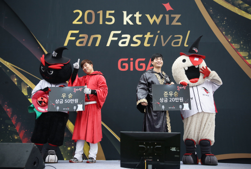 프로야구 kt가 29일 수원 케이티 위즈파크에서 선수단과 팬 300명이 함께 참여한 ‘2015 kt wiz 팬 페스티벌’ 행사를 성황리에 마쳤다. 창단 첫 ‘kt wiz 팬 페스티벌’ 행사는 이날 구장 그라운드에서 팬 300명과 지역 주민 50명, kt wiz 선수단과 구단 직원들이 함께 했다. 김주일 응원 단장과 박수미 장내 아나운서의 환영 인사와 야구 게임, 치어리더 공연을 시작으로 2016 신인 선수들의 신고식과 장기자랑이 이어졌다. 또, kt wiz 복면가왕 콘테스트에는 오정복, 김주원, 전민수 선수가 가면을 쓰고 나와 노래 실력을 뽐냈다.