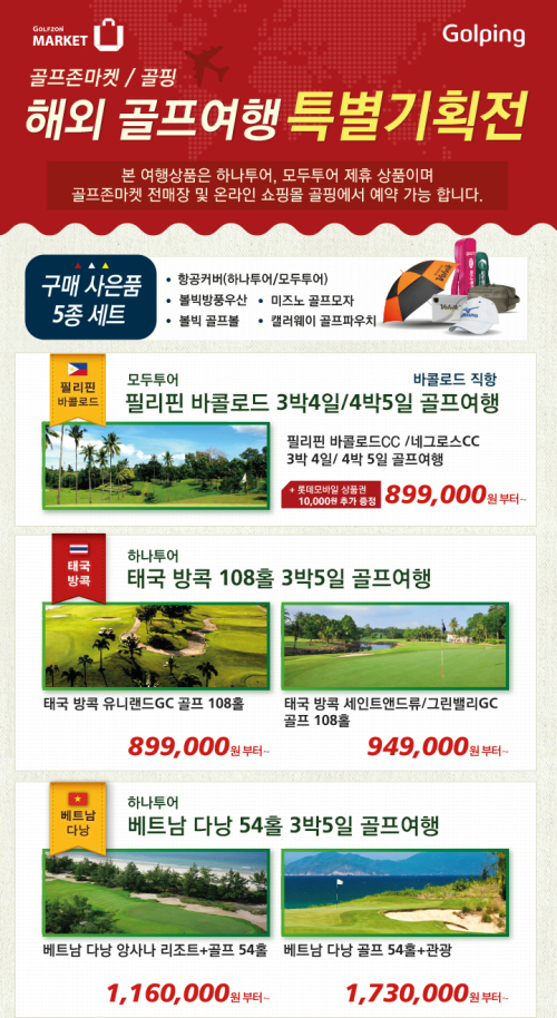 여행상품 구매고객 전원에게는 항공커버, 볼빅 2중 방풍골프우산, 볼빅 3피스 골프볼 15개, 미즈노 골프모자, 캘러웨이 골프파우치 등 25만원 상당의 사은품 5종세트가 함께 제공되며, 고객 중 3명을 추첨해 구매금액 100%를 골프존 통합마일리지로 환급해 준다. 또 모두투어 바콜로드 골프여행 구매 고객에게 롯데모바일상품권 1만원권을 추가 증정하는 등 이벤트도 풍성하다.