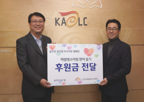 | 지난 8일 한국백혈병소아암협회에서 열린 조식기부금 전달식에서 골프존유원그룹은 조식 기부금을 한국백혈병소아암협회에 전달했다. 한국백혈병소아암협회 기획사업국 최재성 국장(왼쪽)과 골프존 CSV실 양성준 실장. |