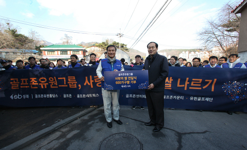 골프존유원그룹(회장 김영찬)은 11일 오후 서울 성북구 정릉에서 서울 근무 그룹사 임직원들과 LPGA 유소연 선수 및 GTOUR / WGTOUR 소속 선수들과 함께 독거노인들을 대상으로 연탄 및 쌀 배달 봉사활동을 펼치고 소외계층 600가구에 쌀을 기증하는 전달식을 가졌다고 밝혔다.