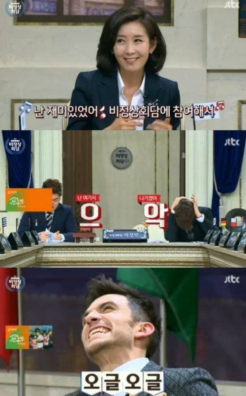 11일 밤 방송된 JTBC '비정상회담'에서는 나경원 국회 외교통일위원장이 게스트로 출연해 '정치에 무관심한 나, 비정상인가요?'라는 안건으로 G12와 토론을 펼치는 모습이 그려졌다.