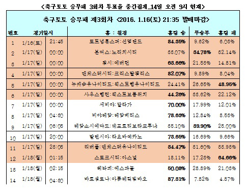 이밖에 선두 아스널이 스토크시티와의 원정경기(12경기)에서 승리하며 선두를 수성할 것이란 축구팬들의 예상이 64.66%로 나타났고, 최근 주춤하고 있는 맨체스터시티가 홈에서 크리스탈팰리스를 무너뜨릴 것이라 예상도 82.07%로 높게 집계됐다.