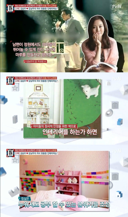 최근 전파를 탄 tvN의 ‘명단공개’의 ‘스타 자녀교육법’ 특집 방송에서 김남주의 자녀 교육법이 순위 2위를 차지, 그 특별한 비법이 공개됬다. 김남주는 자녀들이 앞마당에서 함께 뛰어놀거나 자전거를 탈 수 있도록 잔디를 깔고 십자모양의 나무데크를 설치해 별도의 공간을 만들었다. 또 아이들에게 정서적 안정을 주는 색깔로 인테리어를 해 공부에 집중하기 한층 쉬운 분위기를 조성했고 침실에는 한글 단어장이 들어간 센스 있는 인테리어로 자녀들이 누워서도 공부할 수 있는 분위기를 마련해 눈길을 끌고 있다.