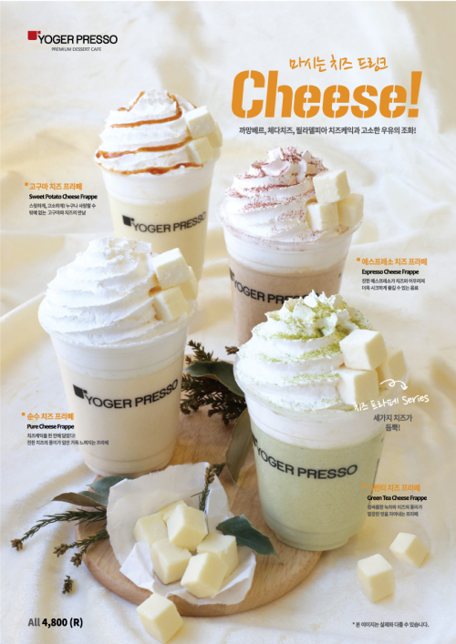 시리즈는 총 4종으로 구성됐다. 마치 치즈케익을 한 잔에 담은 것처럼 진한 치즈의 풍미가 가득한 ‘순수 치즈 프라페’, 진한 에스프레소와 치즈가 어우러져 더욱 시크하게 즐길 수 있는 ‘에스프레소 치즈 프라페’, 쌉사름한 녹차와 치즈 특유의 맛의 조화로 더욱 깔끔한 맛을 자아내는 ‘그린티 치즈 프라페’, 남녀노소 사랑하는 달콤한 고구마와 치즈가 만난 ‘고구마 치즈 프라페’이다.