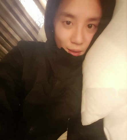 사진 속 김준수는 다소 피곤한 얼굴로 검은색 후드티 모자를 쓴채 침대에 누워 카메라를 응시하고 있다.