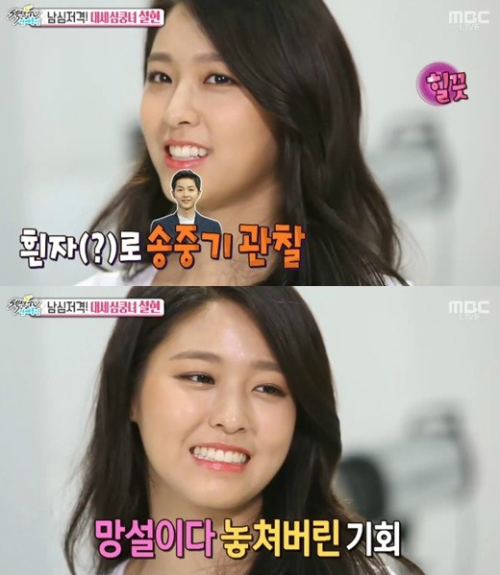 이날 ‘섹션TV’에서 설현은 이상형인 송중기에 대해 "한 시상식에서 뵌 적이 있었다. 그 때 말이라도 걸어볼 걸 그랬다. 다른 선후배 분들에게는 인사를 잘 하는데"라고 말문을 열었다.