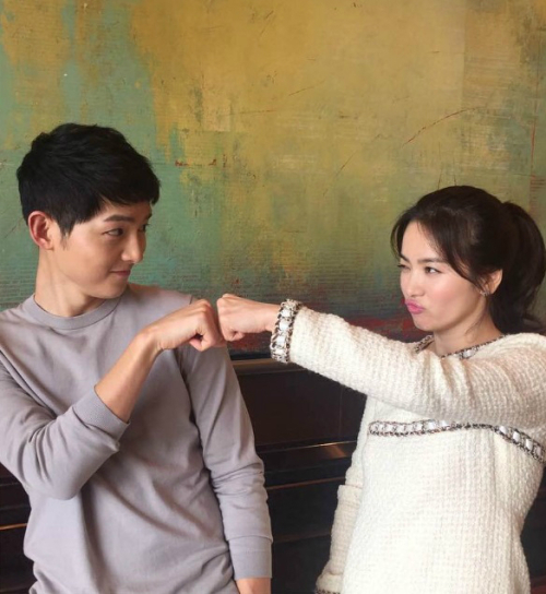 해당 사진 속에서 두 사람은 서로의 주먹을 맞댄 포즈로 익살스러운 상황을 연출했다. 최근 KBS2 수목드라마 '태양의 후예'에서 함께 호흡을 펼치는 두 사람이기에 이를 본 네티즌들은 훈훈하다는 반응을 나타냈다.