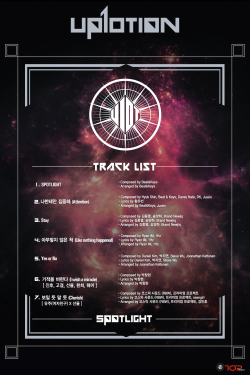 13일 자정 업텐션의 공식 홈페이지와 SNS채널들을 통해 세 번째 미니앨범 ‘SPOTLIGHT’ 의 타이틀곡 ‘나한테만 집중해’을 비롯한 전 트랙의 크레딧을 공개했다.