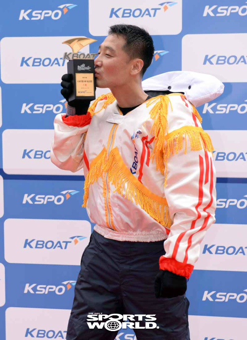 1. 경정 고일수 선수가 1위를 차지한 후 트로피에 입을 맞추고 있다. 하남=김두홍 기자