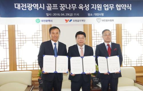 유원골프재단은 대전시(시장 권선택), 대전시골프협회(협회장 차만석)와 지난달 29일 대전시청에서 업무협약식을 갖고, 대전시 골프 꿈나무 육성지원 사업을 위해 상호 협력하기로 했다.