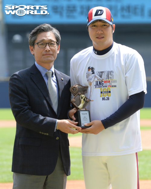[SW포토] 두산 장원준,개인통산 100승 기념식 기사입력 2016-05-08 15:04:24 기사수정 2016-05-08 15:04:24 글씨 크기 선택 가장 작은 크기 글자 한 단계 작은 크기 글자 기본 크기 글자 한 단계 큰 크기 글자 가장 큰 크기 글자 [스포츠월드 김용학 기자] 프로야구 두산 베어스의 장원준(오른쪽)이 8일 잠실구장에서 열린 <2016 타이어뱅크 KBO리그> 롯데 자이언츠와의 경기에 앞서 개인통산 100승 달성 기념 시상식에서 KBO 양해영 사무총장과 포즈를 취하고 있다. 잠실=김용학 기자 yhkim@sportsworldi.com 2016.05.08. [ⓒ 세계비즈앤스포츠월드 & sportsworldi.com, 무단전재 및 재배포 금지] 메뉴보기 페이스북 공유 트위터 공유 url 공유 더보기