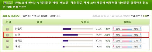 이러한 헤일리 베넷에 버금가는 국내 섹시 스타를 묻는 설문이 맥스무비를 통해 지난 2일부터 8일까지 일주일간 진행되었고, 배우이자 인기 아이돌 AOA로 활동하고 있는 설현이 과반수에 가까운 득표율로 1위를 차지하며 화제를 모았다. 49.8%라는 압도적인 결과는 청순한 외모와는 달리 완벽한 몸매와 솔직한 매력으로 남심을 저격해온 설현과 헨리를 곤경에 빠뜨리는 헤일리 베넷의 팜므파탈적인 면모와 맞닿아있는 것으로 분석된다. 또한 최근 ‘해어화’를 통해 꽃 같은 아름다움을 선보인 한효주가 27%로 2위를 차지했고, ‘태양의 후예’로 다시 한 번 신드롬을 일으킨 송혜교(17.1%)와 ‘응답하라 1988’로 대세를 입증한 혜리(6.1%)가 나란히 뒤를 이었다.