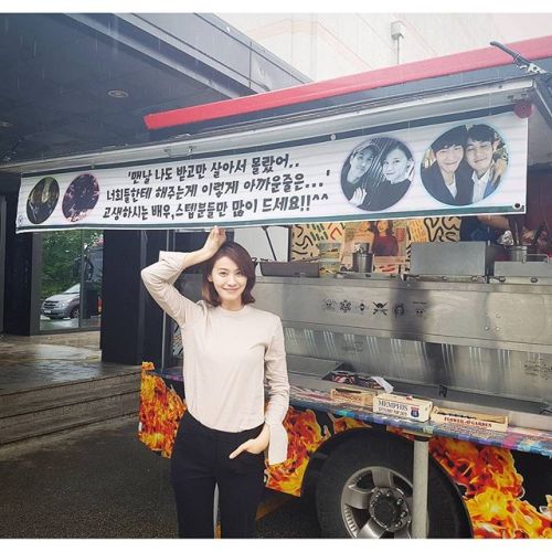 10일 유인영은 자신의 인스타그램에 “간식차와 쏘세지 200인분. 분식좋아하는 나랑 진욱오빠 많이 먹고 마지막까지 힘내라고 간식차 보내준 #김지석 오빠 고마워 김보석 만세!!” 라는 글과 함께 인증샷을 개제했다.
