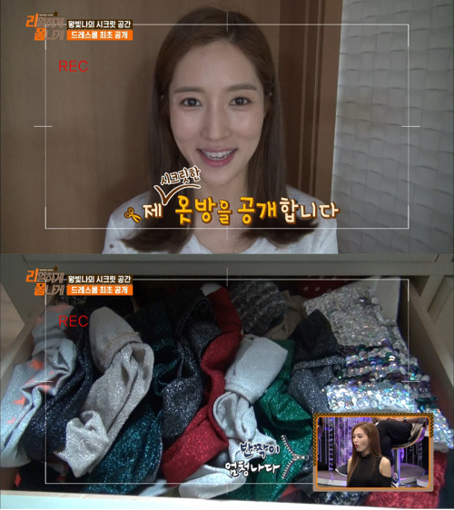 데뷔 16년만에 방송에서 최초로 공개한 왕빛나의 드레스룸은 지금까지의 차도녀 이미지와는 달리 반짝이 의상과 다양한 컬러의 가방들이 정리되어 있었다.