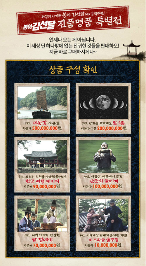 특히 주인 없는 대동강을 팔아 치웠다는 ‘김선달’의 일화를 모티브로 한 대동강 소유권 상품은 여름 수상 스포츠를 위한 최적의 환경과 탁 트인 경관, 아름다운 대동강을 바라보며 풍류, 음주가무를 마음껏 즐길 수 있는 연회장 완비 등의 문구로 웃음을 자아낸다. 여기에 상품 문의란을 통해 구매를 원하는 상품과 이유를 댓글로 남기면 추첨을 통해 ‘봉이 김선달’의 예매권을 증정하는 이벤트가 진행되고 있어 영화를 고대하는 예비 관객들의 폭발적인 관심을 불러일으키고 있다.