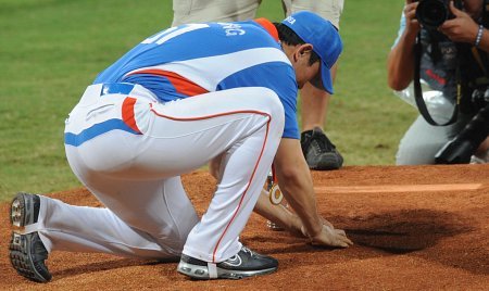 사진=봉중근이 2008년 8월23일 열린 베이징올림픽 야구 쿠바와의 결승전 뒤 마운드위의 흙을 생수병에 담고 있다. 베이징올림픽공동취재단