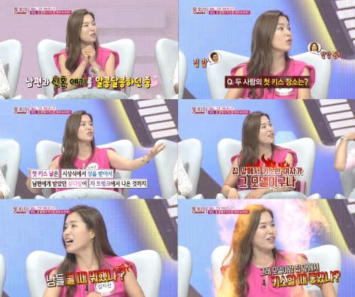 이어 “나는 한강둔치라고 말했고, 남편은 집 앞이라고 답했다. 남편이랑 9개월 사귀고 결혼을 했기 때문에 나는 소소한 것까지 다 정확하게 기억하는 편이었다. 그래도 신혼이고 방송이니까 그 당시에는 ‘저희가 한강둔치에서 키스를 하고 집 앞에서도 했었나 봐요’라고 둘러댔다. 남편과 첫 키스를 한 날은 내가 어느 시상식에서 상을 받은 날이었다. 그래서 남편이 차 트렁크에서 꽃다발을 꺼내주며 첫 키스를 했기 때문에 잊을 수 없다”고 덧붙였다.