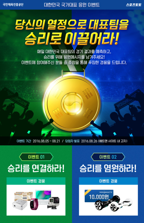 국민체육진흥공단이 발행하는 체육진흥투표권의 수탁사업자인 케이토토(대표 손준철)가 실시하고 있는 2016 리우올림픽 기념 국가대표 응원 이벤트 ‘당신의 열정으로 대표팀을 승리로 이끌어라’가 스포츠팬들의 폭발적인 인기를 얻고 있다.