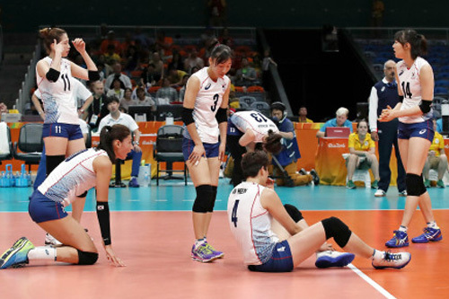 사진 김연경을 비롯한 선수들이 네덜란드와의 8강전에서 실점한 뒤 아쉬워하고 있다. 리우=올림픽사진공동취재단