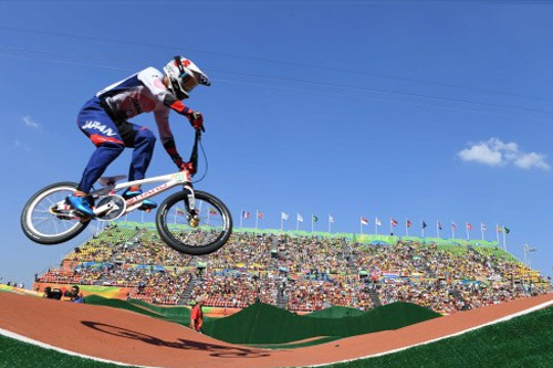 일본의 나가사코 요시타구가 18일(한국시간) 브라질 리우데자네이루 데오도루 올림픽 BMX 경기장에서 열린 남자부 경기에서 힘찬 레이스를 펼치고 있다. 리우데자네이루=올림픽사진공동취재단