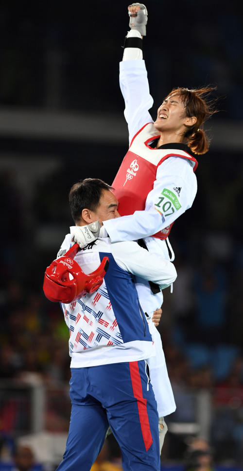 김소희가 18일(한국시간) 브라질 리우데자네이루 올림픽파크의 카리오카 아레나3에서 열린 ‘2016 리우올림픽’ 태권도 여자 49㎏급 결승에 승리하자, 정광채 코치가 달려와 김소희를 들어올리고 있다. / 리우 = 김용학 기자
