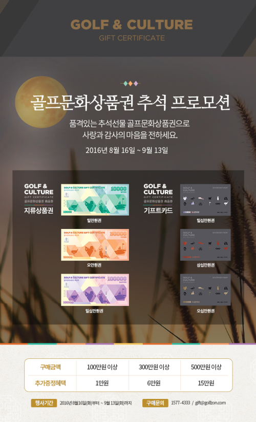 해당 기간 동안 상품권을 100만원 이상 구매 시 상품권 1만원권을 추가 증정한다. 또 300만원 이상 구매 시에는 6만원권을, 500만원 이상 구매하는 고객에게는 15만원권을 각각 추가로 제공한다.