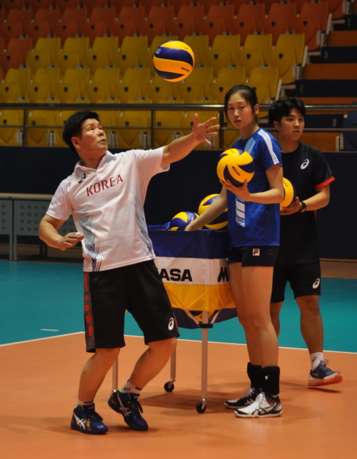 사진2. 김철용 한국 여자 배구대표팀 감독이 지난 12일 베트남 빈푹체육관에서 진행한 훈련에서 공을 때리고 있다. 사진 = 권영준 기자