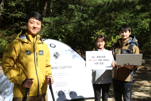 KT 직원들이 충청남도에 위치한 계룡산에서 NB-IoT 기술 기반의 저전력, 저용량 소물인터넷 서비스 ‘IoT Safety 재킷’과 ‘IoT Smart 텐트’를 시연하고 있다. KT 제공