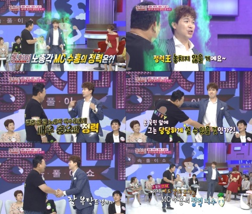 박수홍의 기 테스트 경쟁 상대는 최근 드라마 임진왜란에서 ‘도요토미 히데요시’ 역으로 세간에 화제가 됐던 배우 김응수부터 ‘몸 상태가 안 좋아 급히 약을 먹겠다’는 코미디언 김한국과 신장이 걱정인 코미디언 최홍림까지 모두 유부남이다. 하지만 이들 가운데 유일한 총각인 박수홍이 측정 결과 꼴찌를 기록, 정력 앞에 무릎을 꿇어 스튜디오에 웃픈 상황을 안겼다. 또 단전에 힘을 준 세 사람의 경우 팔을 눌렀을 때 움직임이 없었고, 김응수와 김한국은 90점을, 최홍림은 100점을 기록했다. 하지만 박수홍은 이들에 비해 월등히 팔이 아래로 떨어져 최하위를 차지했고, 주위의 응원에 힘입어 다시 한 번 테스트에 나서는 모습이 그려졌다. 과연 박수홍의 2차 테스트 점수는 몇 점일까?