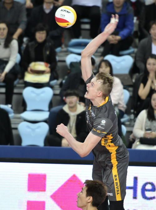 KB손해보험의 외국인선수 우드리스가 30일 인천 계양체육관에서 치른 대한항공과의 ‘NH농협 2016∼2017 프로배구 V리그’ 남자부 원정경기에서 스파이크를 시도하고 있다. / 사진 = KOVO 제공