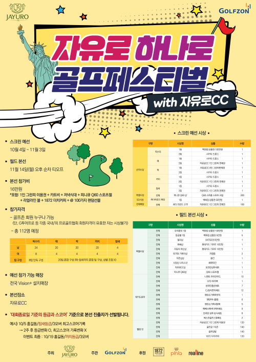 필드 본선의 경우 11월 4일 자유로컨트리클럽에서 샷건 방식으로 열린다. ‘우리동네 1등’ 1인에게는 백화점 상품권 100만원, 등급별 1등에게는 백화점 상품권 5만원, 그외 수상자들에게는 자유로컨트리클럽 그린피 이용권을 비롯해 1872 더치커피 선물세트, Q60 스포츠크림, 시카다드론, 리얼라인 골프공 등의 상품을 증정한다.