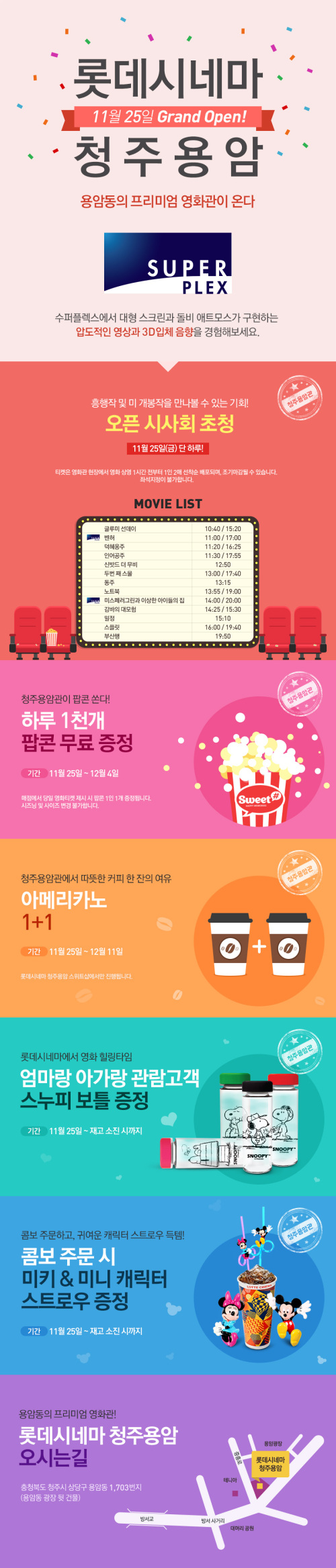 마지막으로 매점에서 콤보 상품 주문 시 미키와 미니마우스 캐릭터 스트로우가 증정된다. 롯데시네마 청주용암과 관련 이벤트에 대한 자세한 내용은 롯데시네마 홈페이지과 모바일 어플리케이션에서 확인할 수 있다.