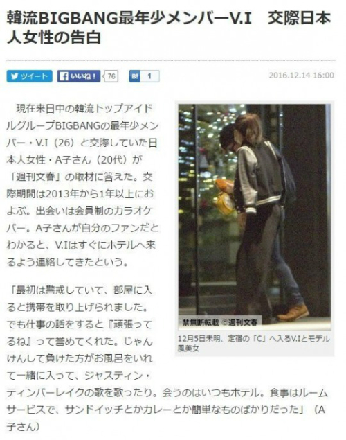 일본 주간문춘는 14일 “빅뱅의 승리가 지난 4일 일본 나고야에서 열린 콘서트를 마치고 아카사카의 한국 음식점에서 식사를 한 뒤 5일 새벽에 한 여성과 호텔로 향했다”고 보도했다, 주간문춘은 선글라스를 낀 한 남성이 여성과 호텔로 들어가는 사진을 함께 게재했다.