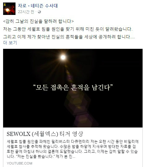 자로는 20일 자신의 SNS에 "어제부터 무수히 듣고 있는 말들"이란 글과 함께 세월호의 침몰 원인을 파헤진 'SEWOLX' 티저 영상을 게재했다.
